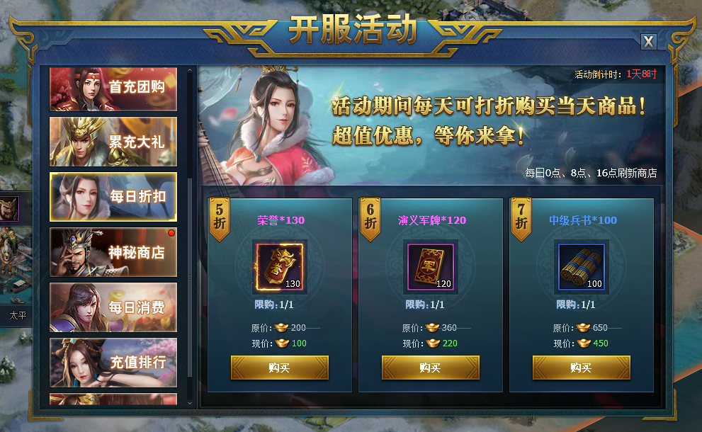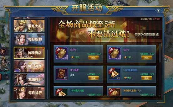1) 活动期间,每天会刷出不同折扣的各类道具,每天的0点、8点、16点刷新折扣商店喔!