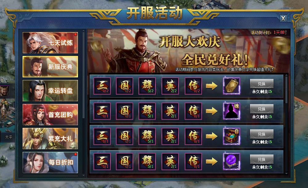 1) 活动期间,参与游戏内的各类玩法,可以获得开服活动庆典文字,收集足够的文字即可兑换丰厚的道具奖励~
